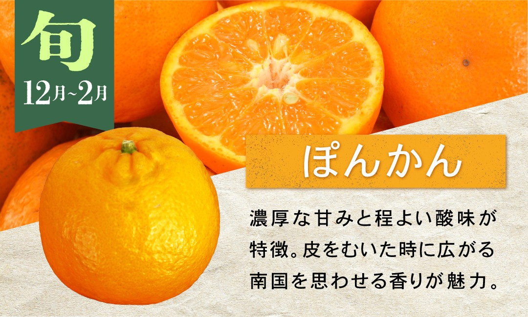 鹿児島の温暖な気候と豊かな自然に育まれた「ぽんかん」は、みかんに似た見た目ながら、ひと味ちがう柑橘です。果肉はやわらかくて甘みたっぷり、酸味は控えめでまろやかな味わい。皮は手でむけて、種も少なく食べやすいため、小さなお子さまからご年配の方まで大人気。鹿児島の冬を彩る、やさしい甘さのごほうびフルーツです。