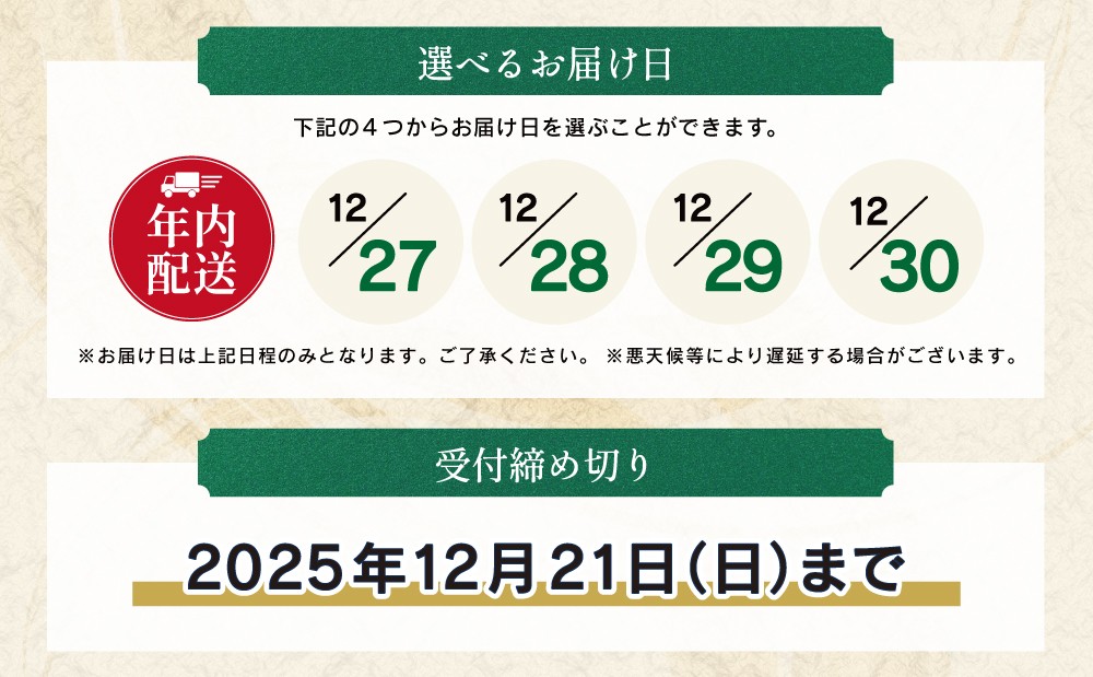 年内に確実に受け取れる、便利なお届け日指定(12/27〜30)に対応した返礼品をご紹介します。南さつま市では、年内にお受け取りいただける返礼品を集めた特集をご用意しました。 お届け日は 12/27〜30 の間でご指定いただけるため、年末のご予定に合わせて安心してお受け取りいただけます。