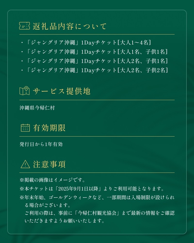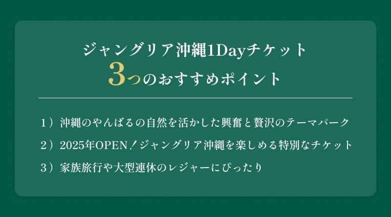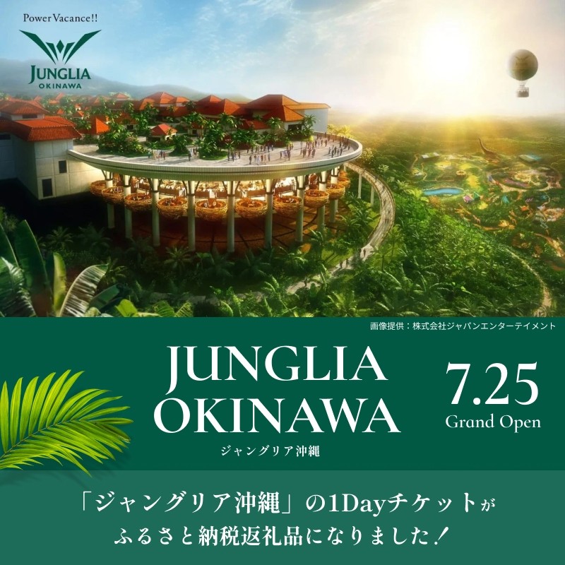 “都会にはない贅沢と興奮“を体験できる新スポットとして、全国から注目を集めている「ジャングリア沖縄」でご利用いただける1Dayチケットを、ふるさと納税の返礼品としてご用意しました。