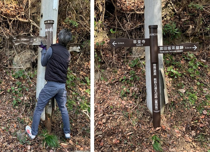 このような道標の補修や建て替えを行うことで、非常に広大な熊野古道及び高野参詣道のエリアを安心して安全に楽しんで歩いていただきたい、そういった思いから県内の市町村と一体となって道標整備を進めています。