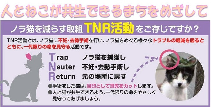 ※TNR活動とは飼い主のいない猫を捕獲し、不妊・去勢手術をして元の地域に戻し、一代限りの命を見守る地域での活動のことです。