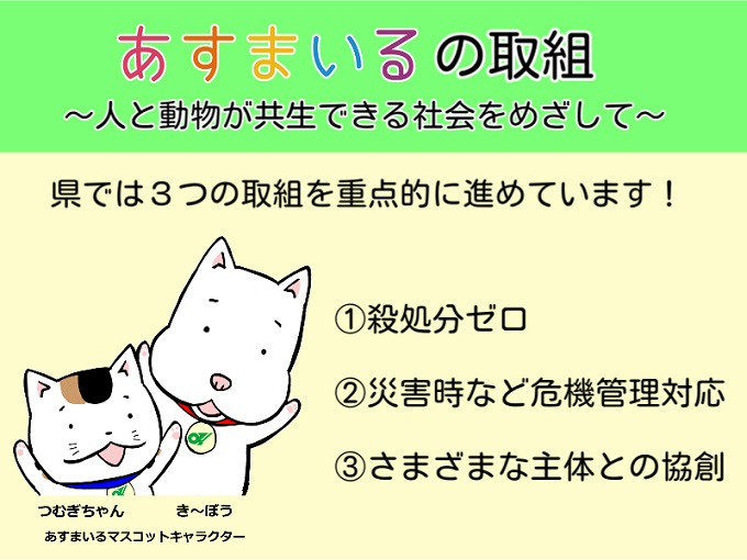 平成23年3月の東日本大震災や平成28年4月の熊本地震等の経験を受け、施設整備等の検討を行い、平成29年5月に「あすまいる」を開所しました。また、令和6年にも能登半島地震が発生しましたが、その教訓を踏まえながら、ペットに関する防災対策をより一層強化していきます。