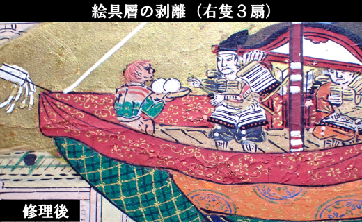 現在、絵の具の剥がれや尾背部分のひび割れ、全体的な汚れの付着などが確認されており、このままでは国宝としての美しさと価値を保つことが難しくなってきています。