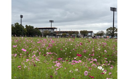 現在、コスモス畑の整備・播種作業を終え、現在は五分咲きの状態となっています。