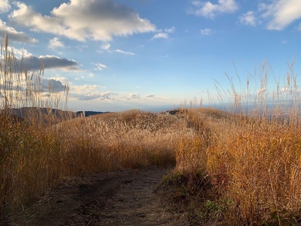 山頂一帯は、茅(すすき)の宝庫で、秋になると黄金の穂が広がり、秋空と相まって息をのむような景観をつくり出します。