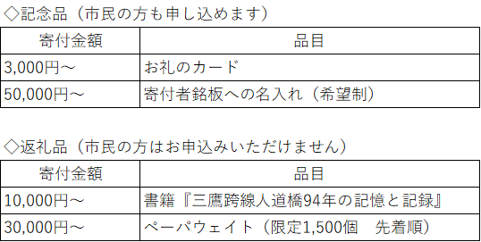 ※目標金額以上の寄付をいただいた場合には、三鷹こ線人道橋の保存に関する事業の費用に充てさせていただきます。
