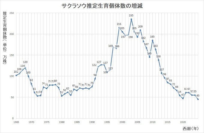 田島ケ原に自生するサクラソウの個体数(推定値)は、平成15年(2003年)に記録した235万株をピークに、20年余りで約5分の1である約45万株にまで激減しています。