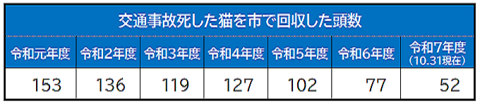 また、市で回収した交通事故死猫の頭数も減少してきていることから、猫の繁殖が抑えられてきていると考えています。