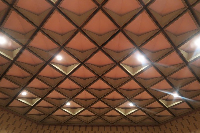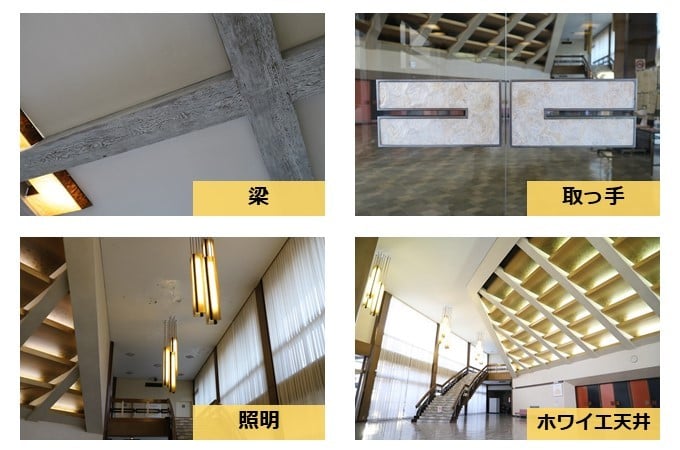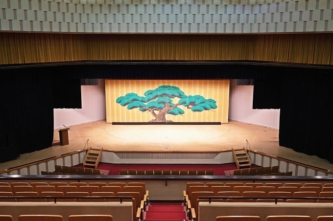 コンクリートに木目を転写させた梁(はり)、螺鈿(らでん)風の美しい貝をはめ込んだ扉の取っ手、特注の照明器具、定式(じょうしき)幕を思わせるホール入口の扉、寺社建築の垂木(たるき)を重ねたような作りで金砂子(きんすなご)を散らした金箔張りのホワイエ天井など、凝った作りになっています。
