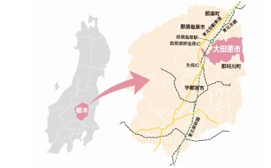 東京から新幹線で70分程の栃木県北東部、関東平野の北端に位置し、那珂川、箒川、蛇尾川(さびがわ)という川に囲まれた那須野が原の扇状地と八溝山(やみぞさん)系の山並みが連なる人口約7万人のまちです。