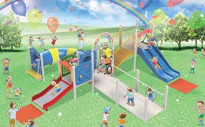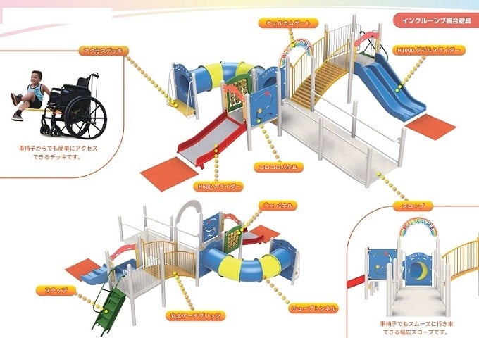 車椅子でもスムーズに行き来できる幅広のスロープや車椅子からでも簡単に滑り台にアクセスできるデッキがある複合遊具を設置予定です。