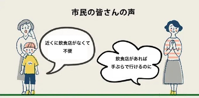 近くにお店がないため、遊びに来る方は、お弁当を持ってこないと一日中遊ぶことができません。軽食を食べれる施設ができることにより、手ぶらできらくやまを訪れ、時間を気にすることなく一日中おもいっきり遊ぶことができます。