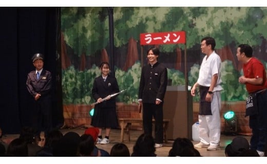 出演者の安井政史さん、奥重敦史さん、石原誠さん、古島拓大さん、服部ひで子さん、やまかさんによる新喜劇に上下中学校3年生からの代表が2名参加させていただき、会場を盛り上げました。