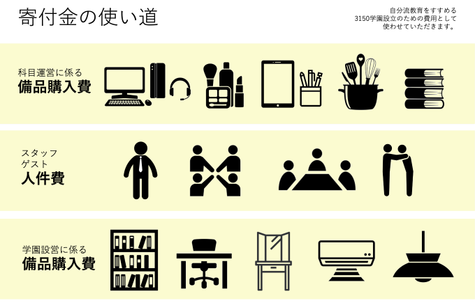 支援いただいた寄付金にて、3150学園を設立・運営していくための費用として活用させていただきます。