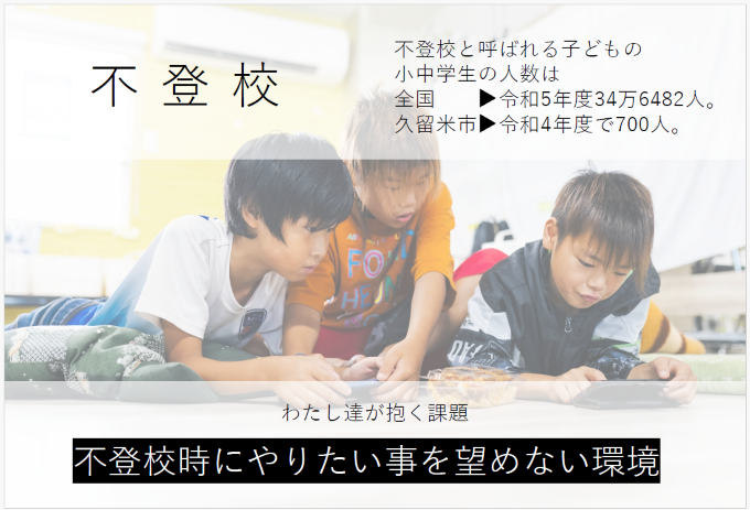 現代において、不登校と呼ばれる小中学生は全国で34万6,482人(令和5年度)、久留米市では700人(令和4年度)と報告されています。