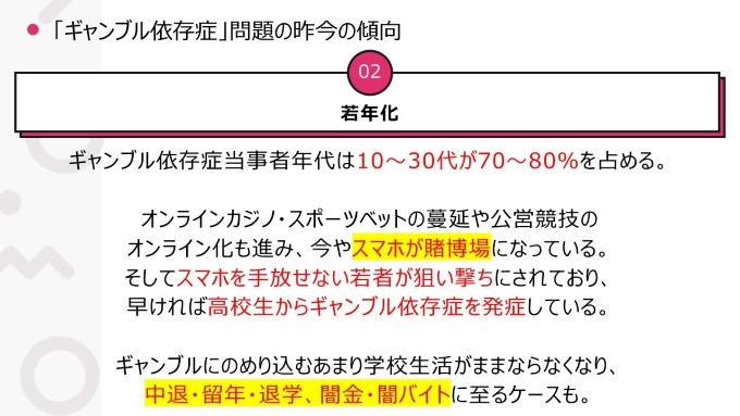 近年は若年層におけるオンラインギャンブルの拡大も深刻です。