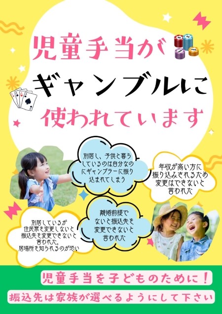 ギャンブル依存症の夫は、児童手当をギャンブルに使ってしまいます。私は子供のための大切な児童手当を守る為、受給者変更を希望しました。