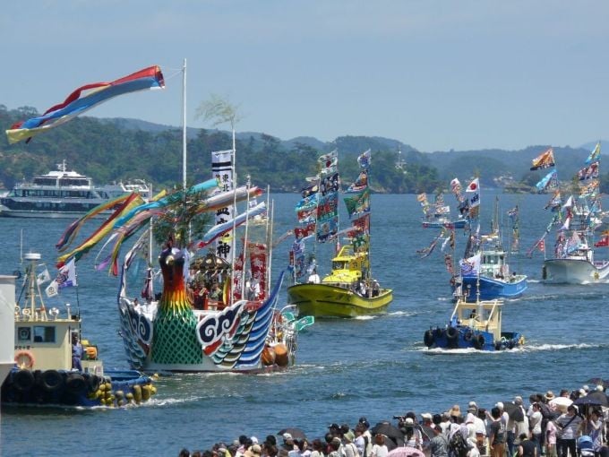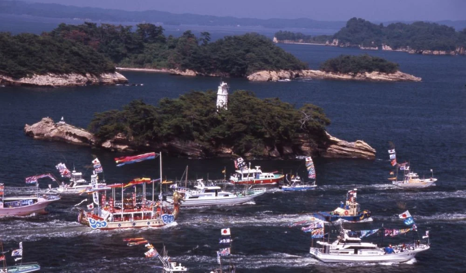 志波彦神社と鹽竈神社の2基の御神輿を泰安した「御座船(ござせん)」と呼ばれる専用船が、大漁旗を揚げた多くのお供の船を従え、大漁祈願・海上安全を祈念し、「松島湾」を巡幸します。