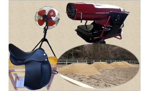 熱風式ヒーター、扇風機、馬房ゴムマット、馬場砂、頭絡、鐙、鐙革、馬場鞍、腹帯、手網、無口、曳手、曳手チェーン、馬着、肢プロテクター、ワンコ、鬣すきナイフ、チモシー、優駿、アルファルファ、ウッドチップ等の飼料、馬具等を整備することができました。