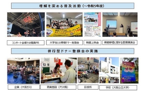 また、NPO法人関西骨髄バンク推進協会や大阪府赤十字血液センターと連携し、ドナー登録者の増加を図るため、『献血併行型ドナー登録会』(献血会場でのドナー登録会)の開催やドナーの入院・通院費を支援しています。