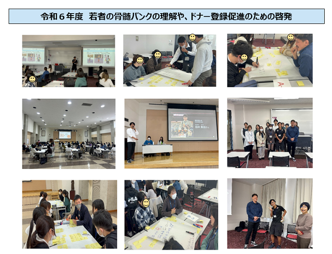 堺市では、令和6年度より、若年層への啓発のため、大学生等を対象に、学校の特別授業の場において、骨髄移植、骨髄バンク、ドナー、そして骨髄バンクドナー登録説明員をはじめとするボランティア活動についての体験者の話を交え、理解を深める取組みを行っています。講演後に、グループワークを実施し、講演を聞いて感じたことや、自らができることなどを話し合い、参加者間で情報共有を行いました。