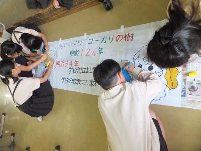 桜井小学校の校歌には「ユーカリの木のように どっかりとこしをすえ」と、ユーカリ樹が歌詞に登場するほど、学校のシンボルとなっていました。
