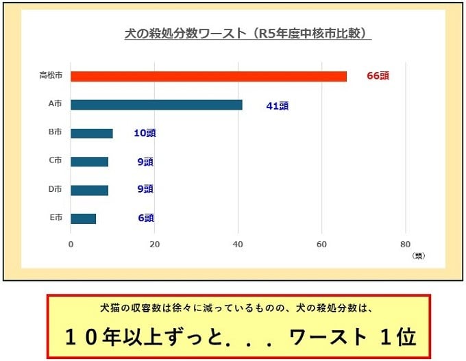 高松市では、犬猫の殺処分数を減少させるために、野良犬・野良猫を増やさないための対策(啓発活動など、収容数減少のための入口対策)と、殺処分される犬猫を減らすための対策(譲渡促進などの出口対策)の両面から、取組みを行っているところですが、高松市の犬の殺処分数は、全国の中核市の中でワーストの状況が続いています。