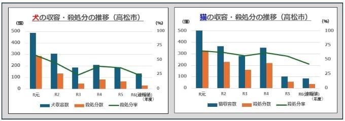 現在、本市では、犬猫の殺処分数を減少させるため、一時保管施設である「高松市動物管理ステーション」の令和8年度の開設に向け、施設の整備を進めるとともに、ミルクボランティア事業や、さぬき動物愛護センター「しっぽの森」での譲渡事業等、犬猫の譲渡促進に積極的に取り組んでいるところでございます。