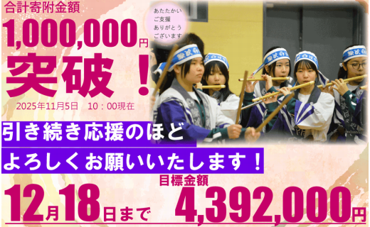 皆さまのご支援により、寄附金額が100万円(町窓口寄附含む)を突破しました。寄附期間は12月18日まで、目標金額4,392,000円です。引き続き応援、よろしくお願いいたします!