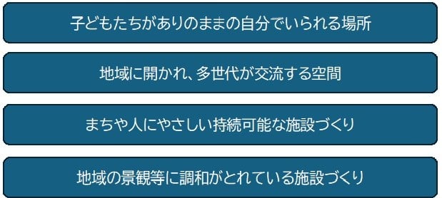 「世田谷区立児童館の整備等計画」に基づき、児童館が整備されていない九品仏地区に、区立奥沢西保育園跡地を活用した、区立児童館と私立認可保育園の複合施設を整備します。整備にあたり、以下の4つコンセプトを設定しています。