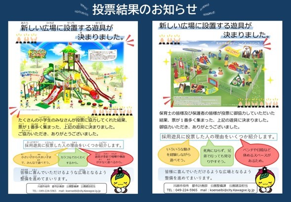 今回整備する遊具は、近隣の小学校や保育園にご協力いただき、こどもたちや先生、保護者の投票により選ばれたものです。
