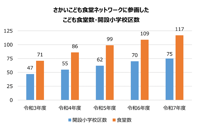 ネットワークを構築した平成29年度以降着実に増加し、令和6年度は70校区で109団体、令和7年10月1日現在では75校区で117団体のこども食堂が活動しています。
