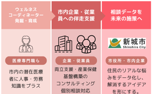今回のプロジェクトでは、新城市商工会がハブとなり、新城市内の複数の地域企業を「ひとつの大企業(組織)」と見立て、自治体×市商工会×地域企業がタッグを組み、支援を強化します。市民(従業員)の声を専門職が支え、そういった心や身体のケアという取り組みをを雇用主である地域企業が支える。このような構造の実現を自治体や関係機関が連携しながら目指します。