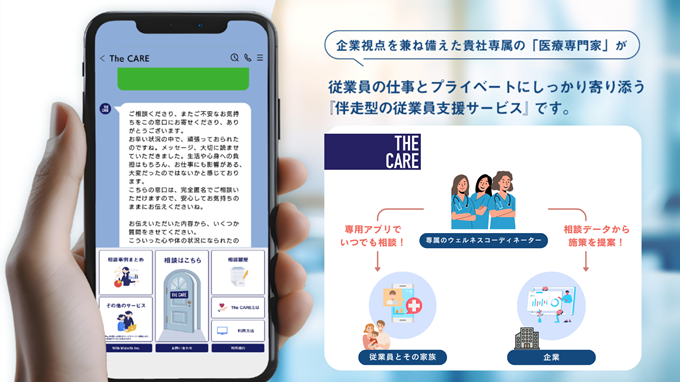 働く人を支援するために、人事や労務知識を身につけた医療専門職「ウェルネスコーディネーター」とチャットアプリによるサービスを複数企業で同時にプレ導入し、従業員や家族の心身を伴走サポート。