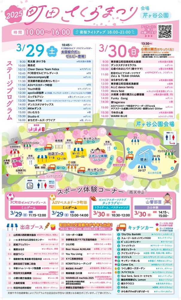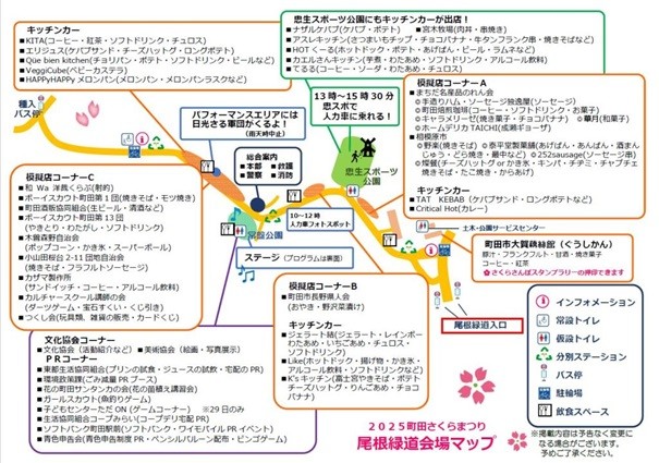 約9kmの緑道では早咲きから遅咲きまで種類豊富なさくらが楽しめ、さくらと菜の花が織りなす風景は必見です。まちだ名産品の出店を始め、模擬店、キッチンカー、展示テントが並びました。常盤公園に設けたステージでは、ダンスやエイサーが披露されました。また、忠生スポーツ公園では人力車の乗車体験を実施するなど、大変盛り上がりました。