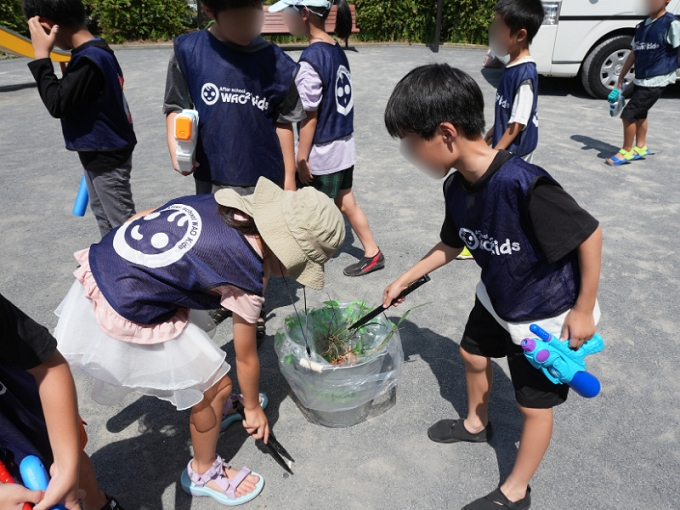 夏の暑い日には、水鉄砲遊びや水まきのあと、サーモグラフィを使って日向と日陰、水まき後の温度の違いを観察しました。 遊びと学びが一体となり、公園はただの遊び場から「考える場所」へと変わりつつあります。