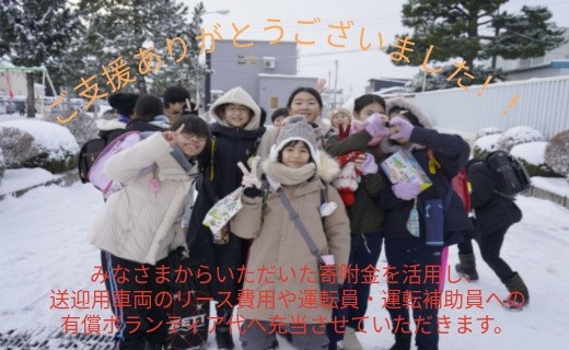 みなさまからいただいた寄附金を活用し、送迎用車両のリース費用や運転員・運転補助員への有償ボランティア代へ充当させていただきたいと存じます。