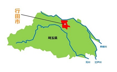 行田市は東京都心から電車で約70分、さいたま市から約30分圏内に位置しています。市の北には利根川、南には荒川が流れ、その他多くの河川や水路が市内を縦横に流れるほぼ平坦な土地です。