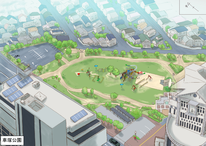 平成18年開園の車塚公園は、約5haにおよぶ広大な敷地に豊かな緑や憩いのスペースはもちろん、最新の防災設備を備えることで、災害発生時には、一時避難地として市民の安全を守る公園となっています。