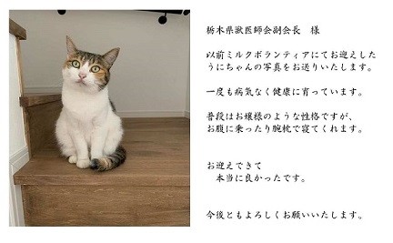 離乳前の子猫の飼育支援を適切な技術と環境を有する動物病院で行うことで、病気のない健康な猫が譲渡可能な状態まで育成され、また、動物病院がかかわることで、新たな飼い主も猫の健康に関して安心して引き取れることから、殺処分数を削減していくには非常に重要な取組であります。今後も当会として引き続き積極的に関わっていきたいと考えております。