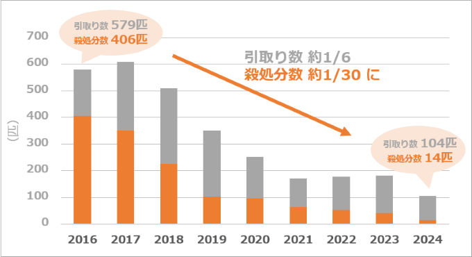これらの取り組みにより、条例施行前の2016年度に比べ2024年度には、猫の引取り数は579 匹から104 匹(約1/6)に、殺処分数は406 匹から14 匹(約1/30)へと大きく減少しました。
