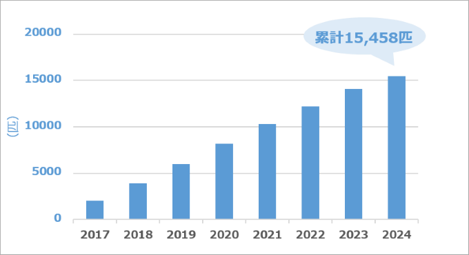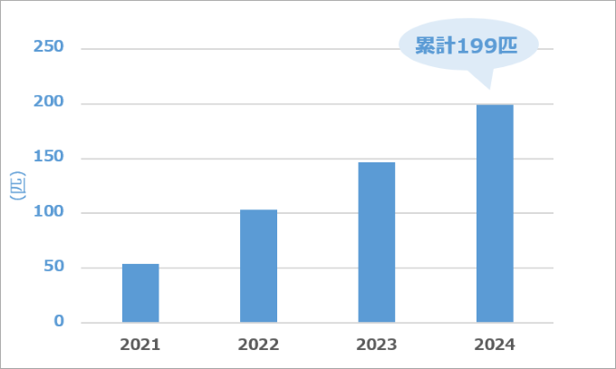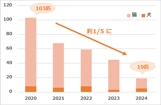 これらの取り組みの結果、センター開設以来、計199匹の犬猫に新しい家族が見つかり、犬猫の殺処分数はセンター開設前の2020年の103匹から、2024年には19匹と、約1/5に減らすことができました。