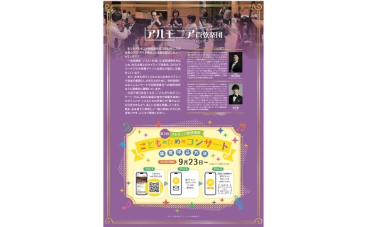 小編成のオーケストラ伴奏で、様々なソロ楽器(弦楽器・木管楽器・金管楽器・鍵盤楽器・声楽など)を演奏することで、楽器による音域や音色、印象の違いを体感しやすい演出で、こどもたちが興味を持てる要素を盛り込み、定期演奏会等でも、こども招待企画を継続しながら、将来的にはアルモニアのユース部門創設につなげていく環境を整備していきます。