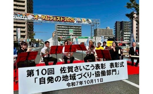 2002年の創立以来、23年にわたる地域での定期演奏活動や、未来を担う子どもたちに音楽を届ける活動を評価していただき、佐賀県知事から「佐賀さいこう表彰」をいただきました。表彰式では演奏の機会もいただき、晴れ渡るさわやかな秋空の下、金管五重奏を演奏いたしました。