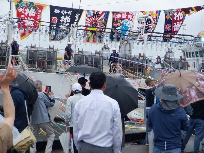 酒田舞娘や和太鼓の演奏の応援を受け、色鮮やかな紙テープをまとい、汽笛を鳴らしながら出航していく中型いか釣り船の勇ましさは酒田でしか見られない素晴らしい光景だと思います。