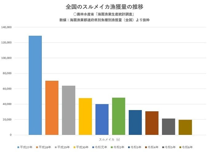 グラフは農林水産省の統計資料からの抜粋したもので、平成27年に12万トンを超えていたスルメイカの水揚が令和6年には2万トン弱と約10年間で1割以下まで大きく減少しました。