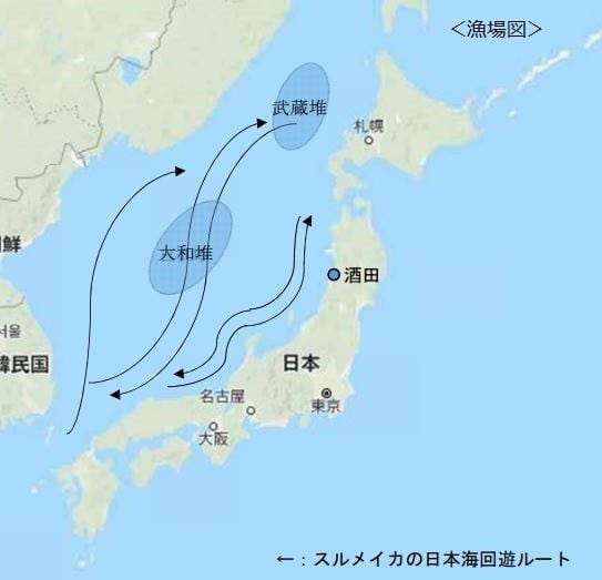 船凍いか釣り漁業は、酒田港から西へ約600㎞にある大和堆や北海道西沖の日本海を主な漁場とし、北上するスルメイカを追いながら1か月から2か月の周期で約半年ほどかけて沖合で操業が行われます。