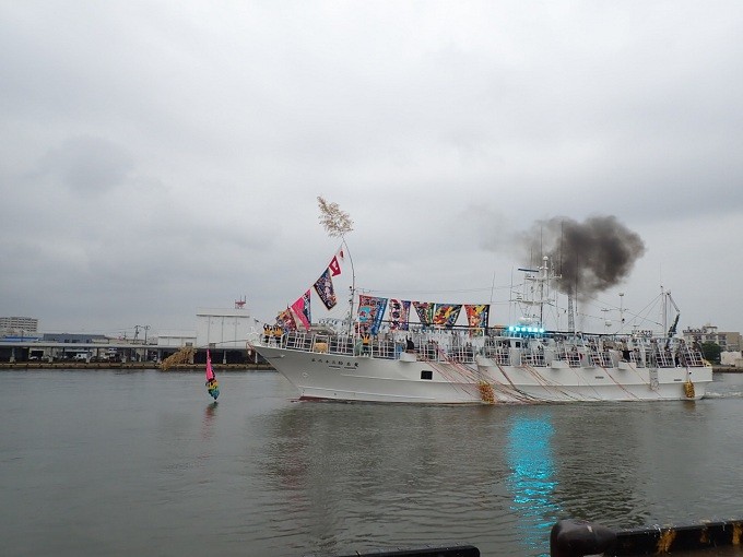 今年もスルメイカの大漁と乗組員の安全を祈願する「いか釣り船団出航式」が賑やかに開催され、山形船友漁撈長会所属の中型いか釣り船が力強く出航しました。いか釣り船は大和堆や北海道沖、ロシア沖などを中心に約8か月にわたりスルメイカを追い、操業を続けます。