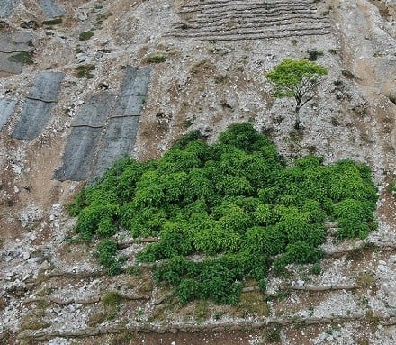 斜面を安定させた結果、伊吹山のニホンジカが好まない「クサギ」という植物が繁茂しました。