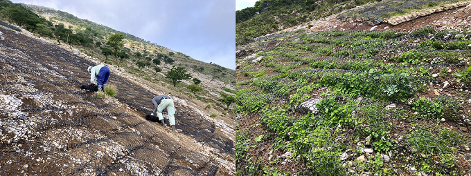 2025年は、国や県の支援をいただきながら、南側斜面の8合目~山頂付近にかけて、約5000㎡で植生復元事業を実施しています。事業の内容としては、「ヤシ繊維ネット」を地面に固定し、土壌の流出を防ぎながら植生の回復を促す「伏工」や、水の流速を抑え斜面を安定化させる「筋工」を進めています。